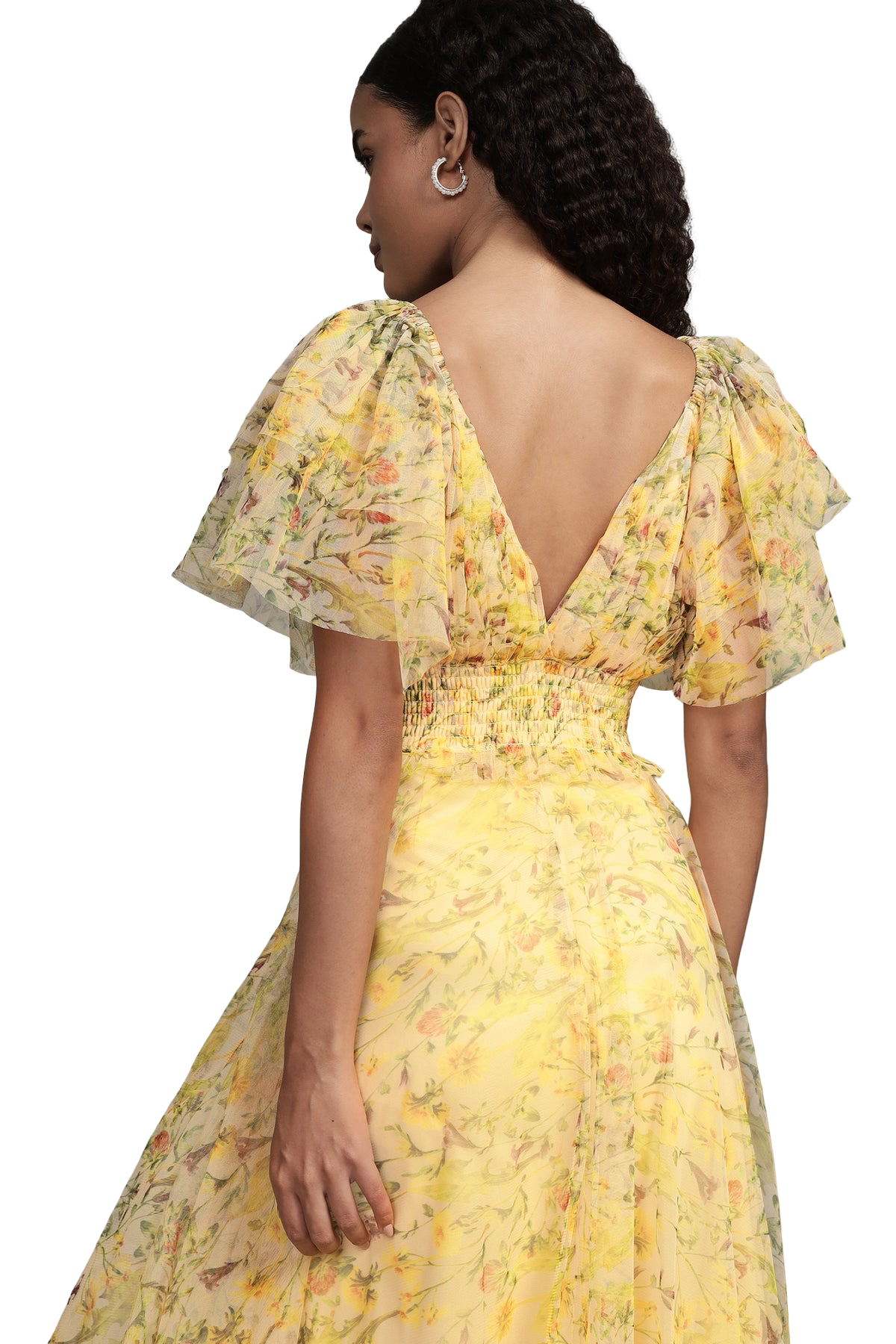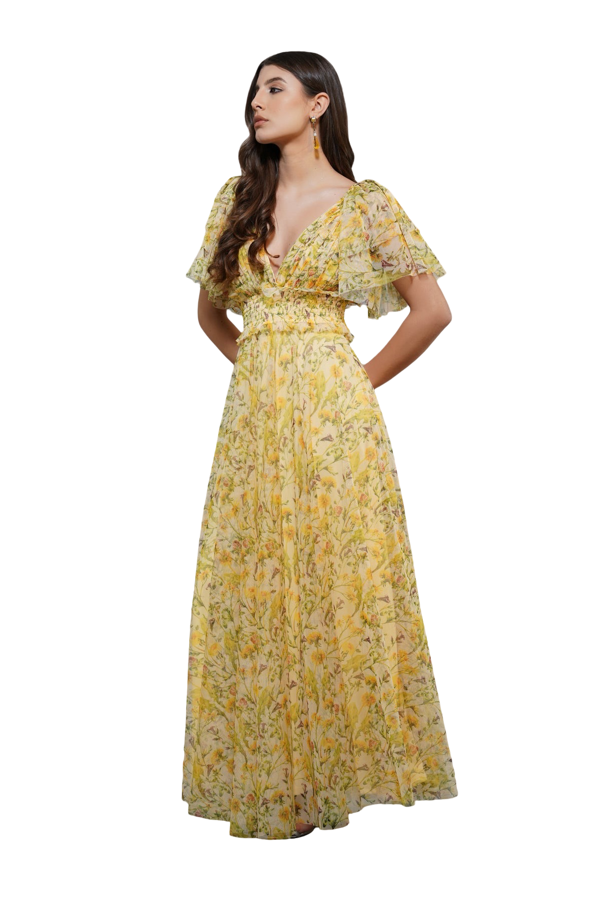 This stunning sundress is your go-to choice for an effortlessly look at any event. Whether you're searching for the perfect garden party dress or a stunning wedding guest dress, this printed yellow dress has got you covered.