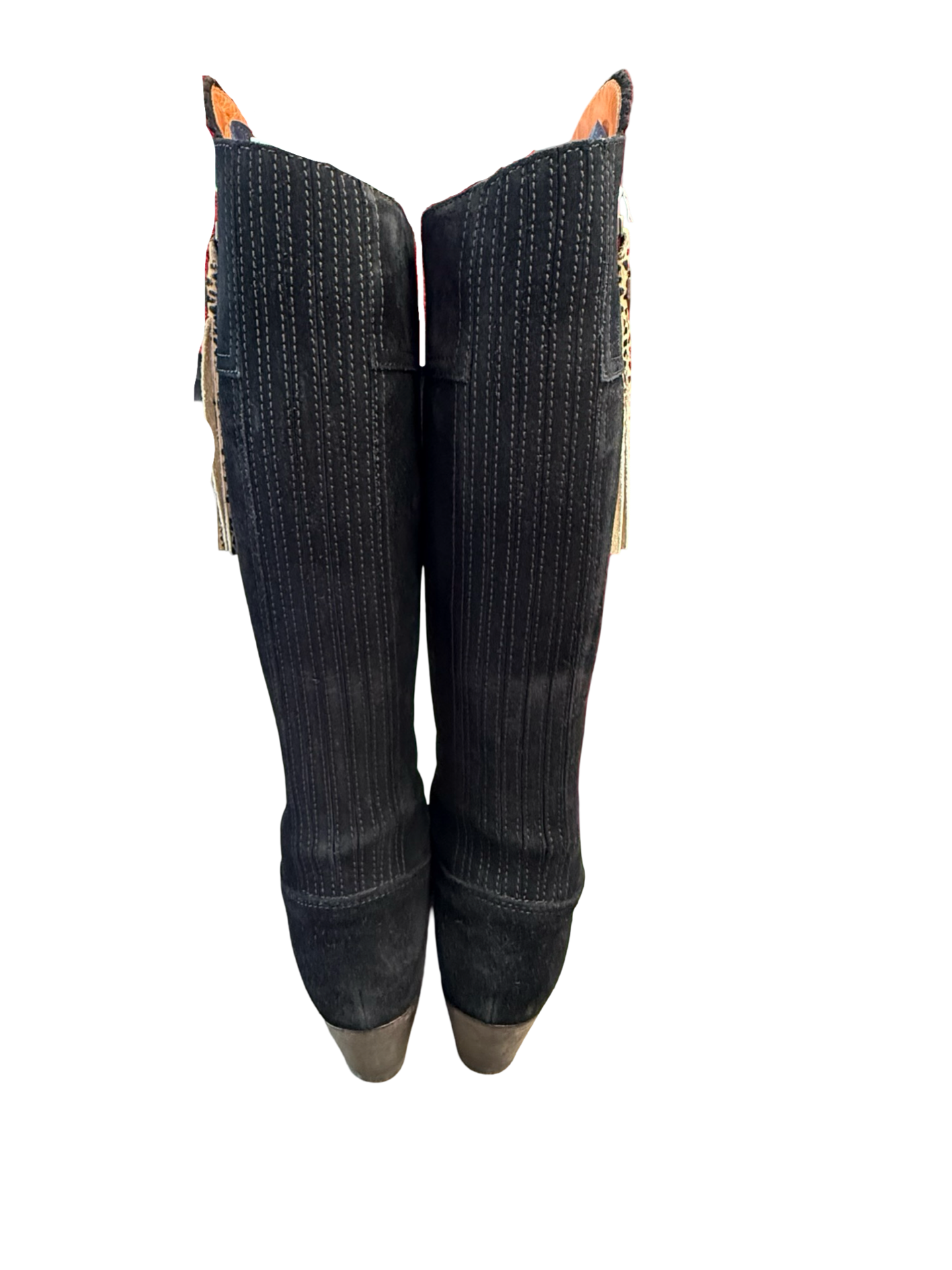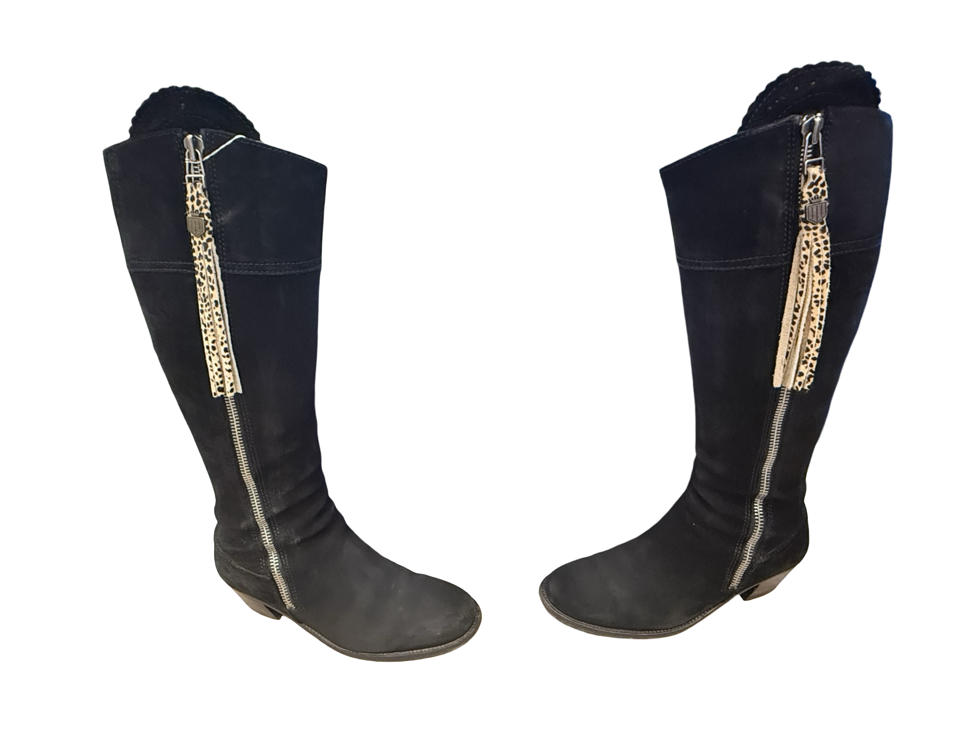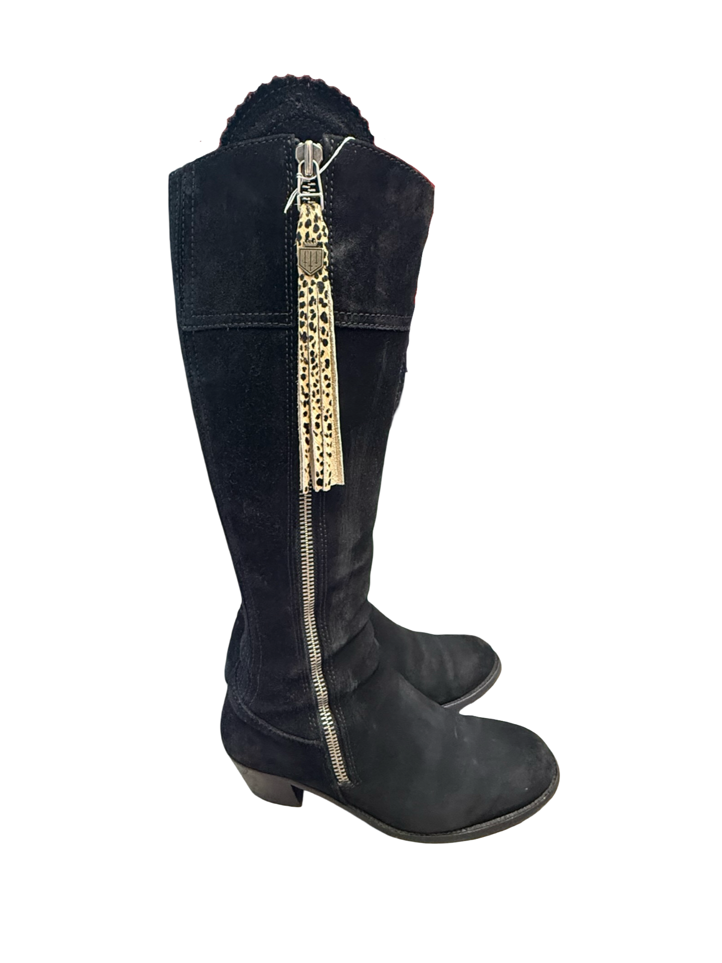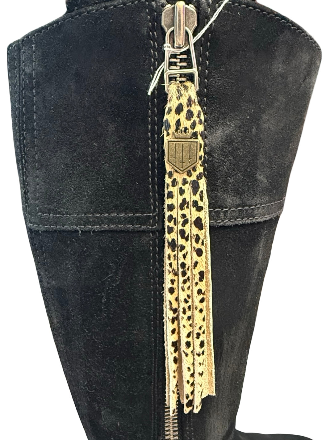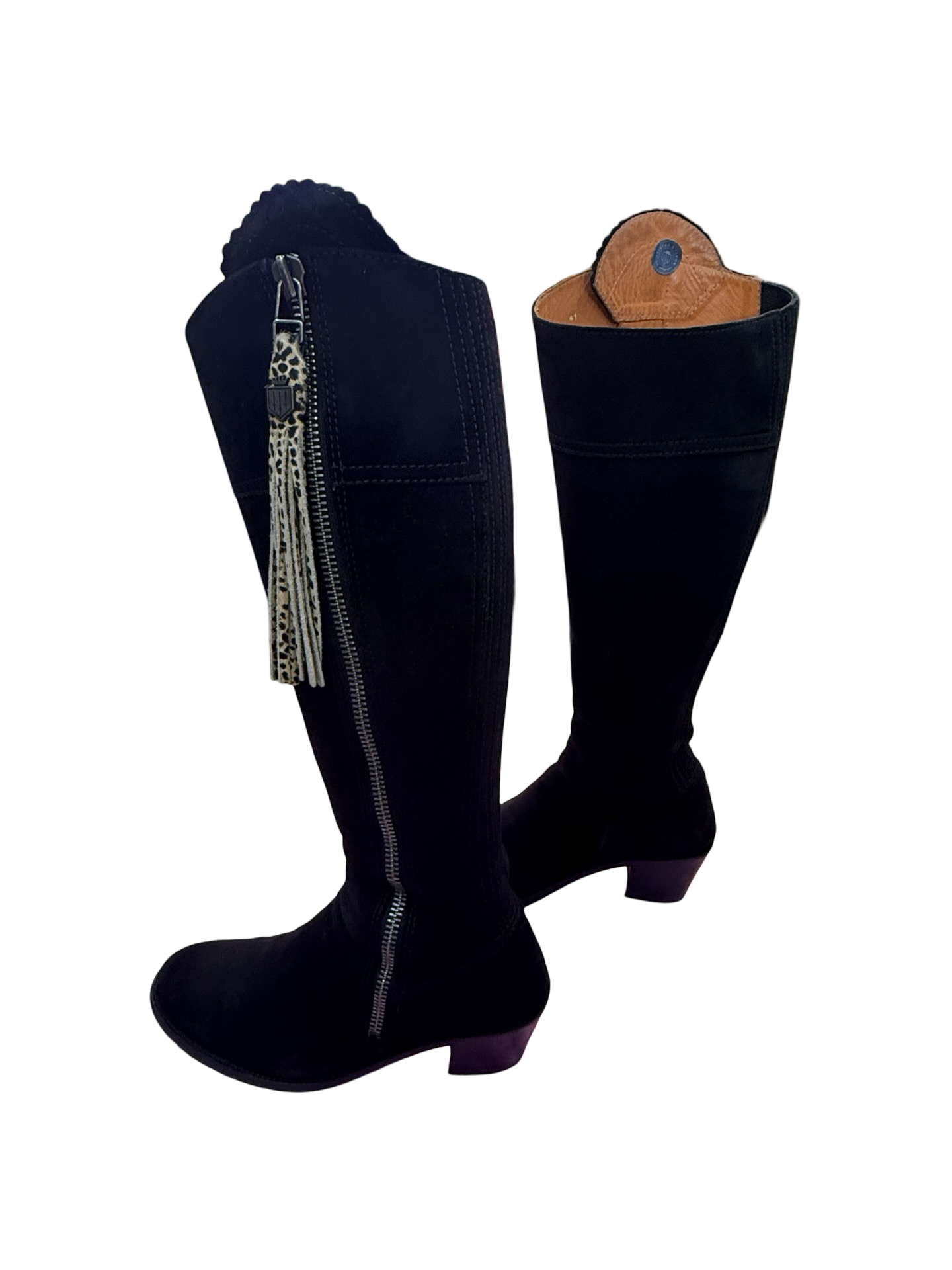 Step out in timeless country-to-city style with these iconic Fairfax & Favor Regina Boots. Crafted in luxurious black suede, these knee-high boots feature the brand’s signature scalloped edging and interchangeable tassel detail – shown here in a chic leopard print for an added touch of personality.