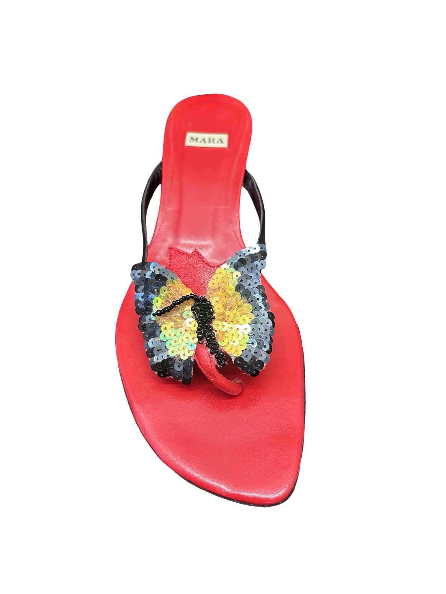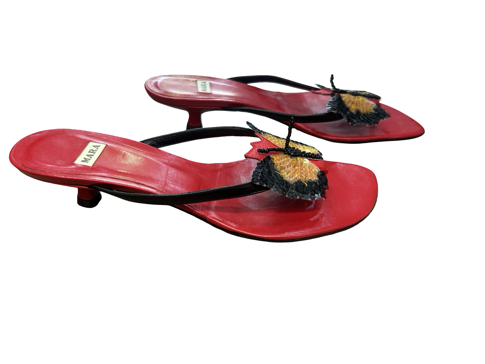 Featuring an embellished butterfly design and a low kitten heel.